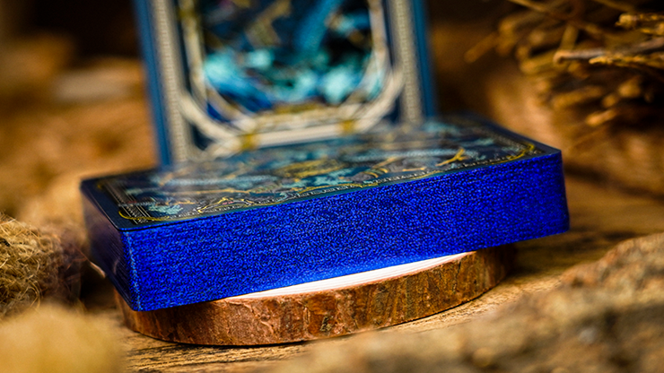 The inside of the tuck box and the backs of the cards feature full-color designs, while the playing cards themselves are fully metallic foiled with gilded edges.