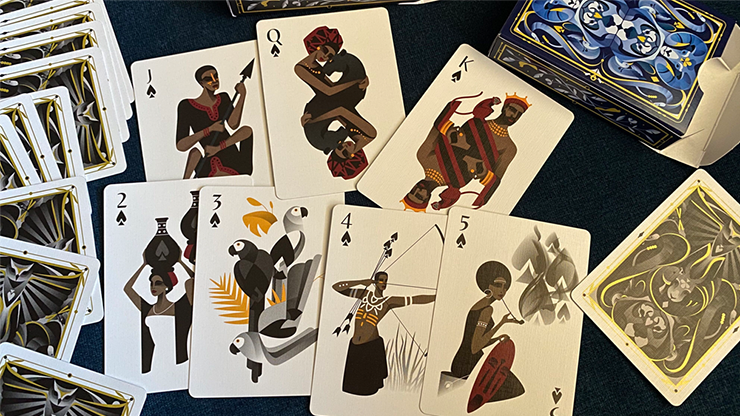 Each suit is an entire world of kings, queens, warriors, and legends. This deck of cards is filled with unique natures, heroic deeds, stories, and culture. The Illustrations of this new deck expresses four unique worlds through color and rhythm.