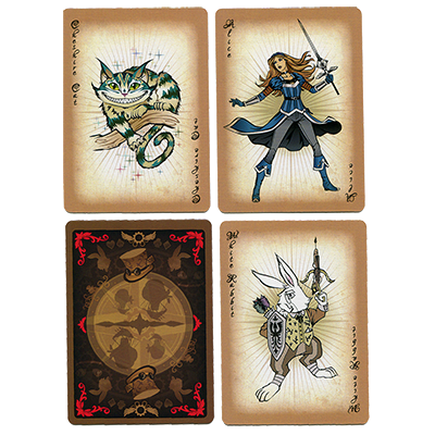 Included in this deck are Alice, the Cheshire Cat, and the White Rabbit as the Joker playing cards illustrated in full pose and in the same black and white line art as the royal face cards.