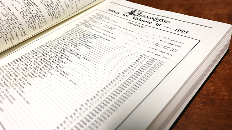 With over 325 card and close to 70 coin effects, routines, ideas, and over 110 other effects with: bills, bottles, boxes, candles, card cases, business cards, keys, matchboxes, rings, roses, rubber bands, scrabble tiles, silks, spoons, balls, shoelaces, thimbles, wallets, gambling demos, sugar packet, book tests, chain loops - and more, Apocalypse #4 continues in the tradition of volumes 1, 2 and 3.