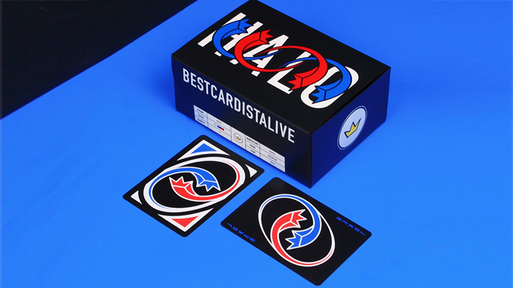 Striking all-black design. This amazing deck features our HALO silhouette vibrant red/blue pips and simplified Court cards. Perfect for cardistry!