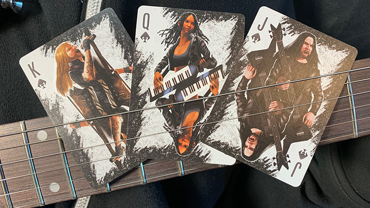 Get ready to ROCK... your next card game or magic routine with the fully custom, limited edition Rock & Roll Bicycle Playing Cards. The Court cards represent musicians from various rock genres such as metal, punk, emo and pop. The Aces are drummers and the Jokers are a security guard and a fan. Also included are a double back and face card to perform 2 Card Monte and other magic tricks (instructions not included). So, grab a deck and get your show on the road.