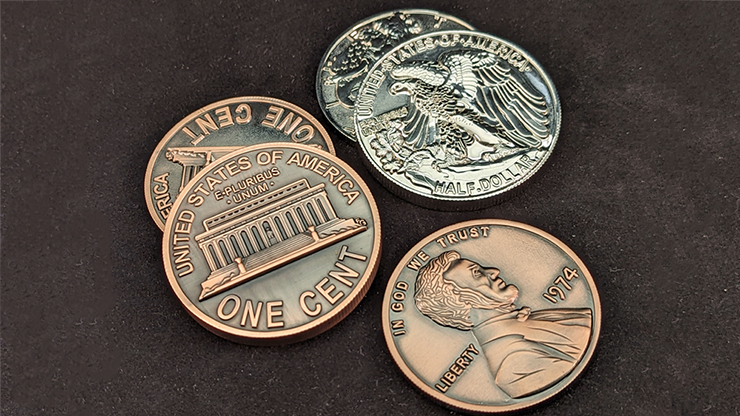 For a long time, magicians have used poorly made jumbo coins that did one thing - "OH LOOK! A BIG COIN!" RFA Productions and Ryan Bliss have worked together to create a custom made five piece copper and silver set that includes interchangeable shells and a matching copper/silver coin. At 2.5 inches in width, the coins allow lovely work for both platform and close up performances. To prevent wear, the plating on the coins is very heavy and the shells are engineered to last for years without bending! The instruction videos include routines and ideas to help you integrate the set into your performances.