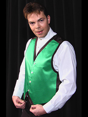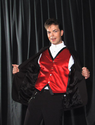 The magician is seen wearing a normal vest, buttoned at the front and worn showing out from under an open jacket. The magician turns to his table to take a prop from the table top. Upon turning back to the audience the vest is seen to have changed color.