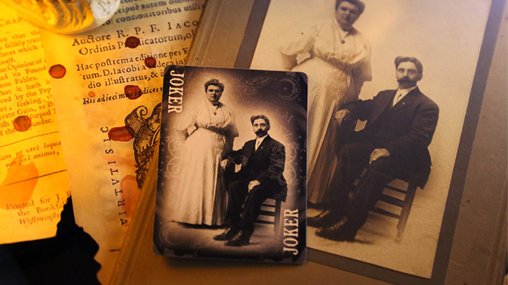 The non-matching Jokers feature two sets of couples (one standing and one sitting in each instance). Custom PIPS are included in the design. The gold Diamonds and Hearts feature the pentagram and a pair of snakes. The white Clubs and Spades depict the pentagram and the skull-like marking from the Death's-head hawkmoth.