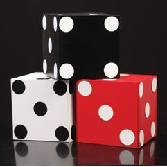 A flat square with 1 dot at one side and 5 at another side, when turned changes to 2 and 4 dots respectively. Finally they change to 3 and 6 dots. Further toss the flat square in mid-air, instantly it changes to a Jumbo Dice.