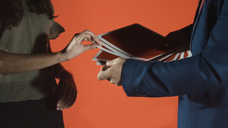 The audience can see that the cards from which the spectator must select their drink consist of duplicates of the prediction that is inside the paper bag. The spectator is now invited to select any card after the magician moves the cards one at a time from the top to the bottom of the deck. The audience is laughing since they can see that all the cards are the same. The spectator calls out the name of the chosen card (Coke) and the audience is shocked to hear that the selected card is NOT the same as the prediction, which is a bottle of Fanta that is inside the paper bag.