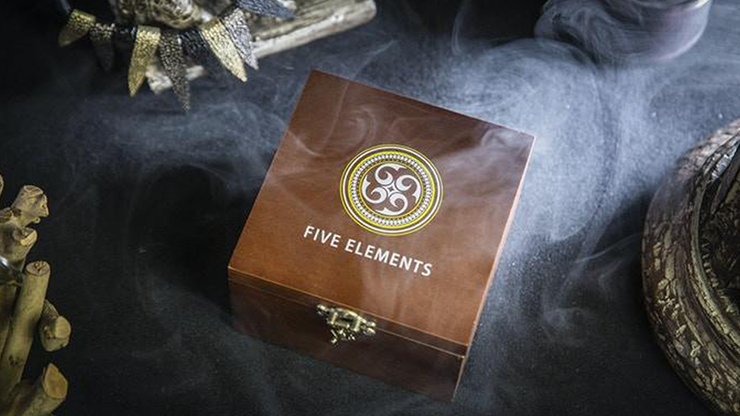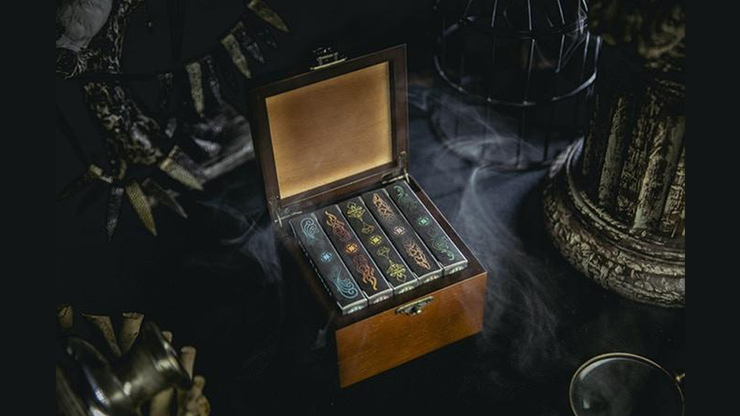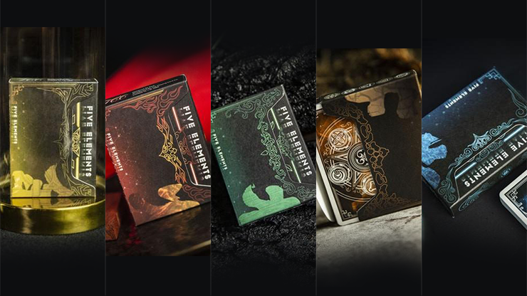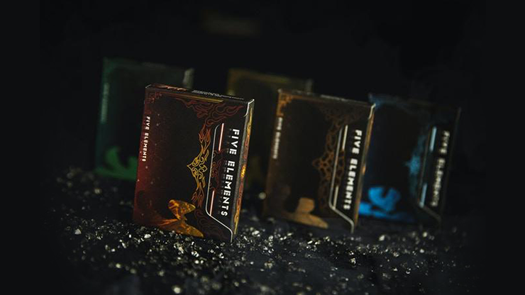 Five decks of cards are quietly displayed inside the box. The patterns at the bottom of the deck work together to form a continuous and interrelated matrix from which the magic of the mysterious five elements seems ready to burst.