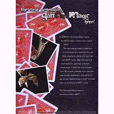 Wait no more! The next generation of gaffed card magic is here! In 2006 the Doorway Magic team decided to start a new project called GAFF. The idea was to make a collection of techniques and methods that would allow anyone to create and use their own GAFF cards. After two years of hard work our goal was achieved: A full length 4 DVD set that includes over 40 amazing effects and a detailed collection that will teach you all the techniques and fine details on how to create and make your very own professional looking gaff cards.
