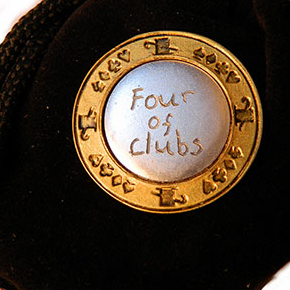 MetalWriting proudly presents The Gamblers Poker Chip. This new product in the MetalWriting range is suited for close up performances. The performer hands out a small velvet bag which contains a poker chip. The members in the audience can feel the shape of the poker chip through the cloth and one member of the audience holds the bag closely in his hand. A spectator is to name any card in a deck of cards. After some by-play the performer opens up the velvet bag. He brings out a beautiful poker chip. On the back of the chip, the spectator's selected card is engraved into the metal.