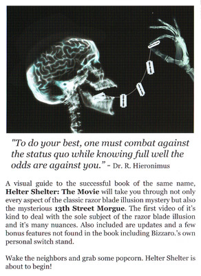 A visual guide to the book of the same name, Helter Shelter will take you on a journey through the gruesome details of the Razor Blade Illusion Mystery as well as the haunted 13th Street Morgue. The first video of it's kind to explain the intricate workings of the razor blade illusion as well as tips, tricks, advice, and even a few unique effects exclusive to this video... including the never before seen Bizzaro Fan Stand.