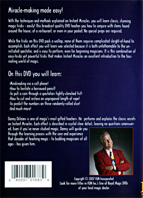 Danny Orleans is one of magic's most gifted teachers. He performs and explains the classic secrets on Instant Miracles. Each effect is described in crystal clear detail, leaving no questions unanswered. Even if you've never studied magic, Danny will guide you through the learning process with the care and experience that decades of teaching magic - to budding magicians of all ages - has given him.