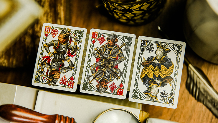 Each boxset contains two decks of cards: one gold and one silver. On the front of each is an illustration of a sword. If you put the back of two decks together side by side, the illustrations will be stitched together to form a picture of knights dueling.