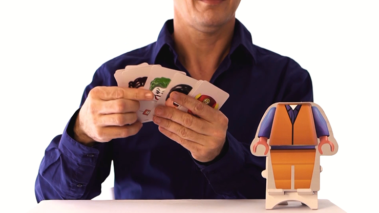 A Lego figure is shown, with its torso and legs but without the head. The spectator picks between different character images of their heads. The magician says he knew which head they will pick, showing the back matches the character. As a great finale, with a little hit in the card, the figure explodes and the full character image appears.