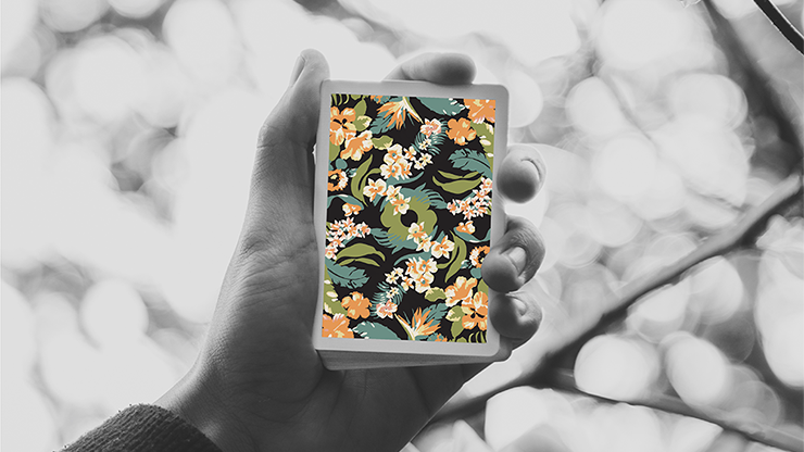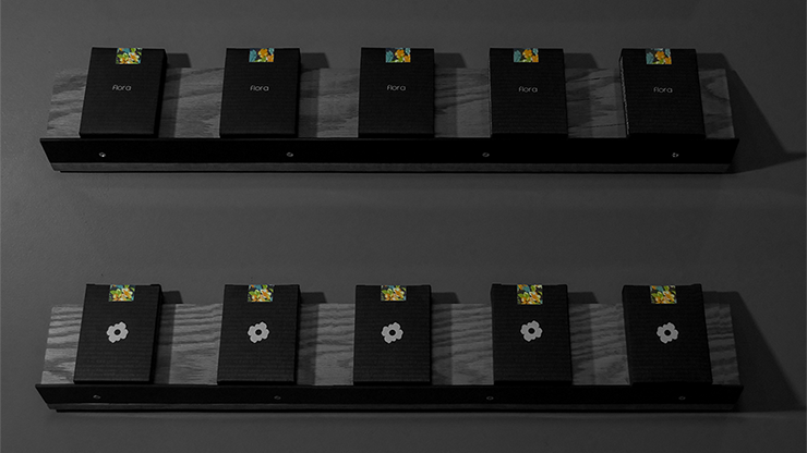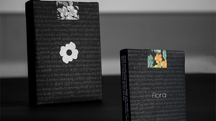 This is the second edition of Flora Playing Cards. Originally teased as an advertisement card in Red Floras, Black Floras are now available. The back design still features a memorable floral print in an array of vibrant colors, yet the background color now features solid black. This allows the floral print to pop out and not get lost within the background color. The illustration of the design has also been slightly modified for aesthetic improvements. The deck was printed by The United States Playing Card Company on Air Cushion Finish with their Crushed Stock. Thus, the deck is optimally thin for card handlers including magicians and cardists. As a result of its thinness, it feels remarkably smooth to handle, and promotes long lasting use. The tuck case has been beautifully handcrafted by Clove Street Press, a San Diego based letterpress company. The box features the word 'Flora', or the closest equivalent, written in 25 different languages in both striking metallic grey ink as well as matte finish, white foil. The box, itself, is premium matte finish paper. There is also a colorful seal which alludes to the back design.