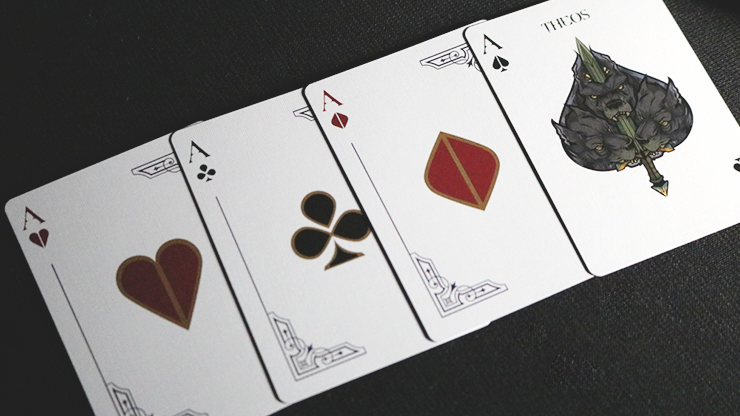Theos is a completely customized deck of cards. Designed By Parama Playing Cards and manufactured by The United States Playing Card Company on Bee stock. Box made by Lotrek (Oath playing cards).