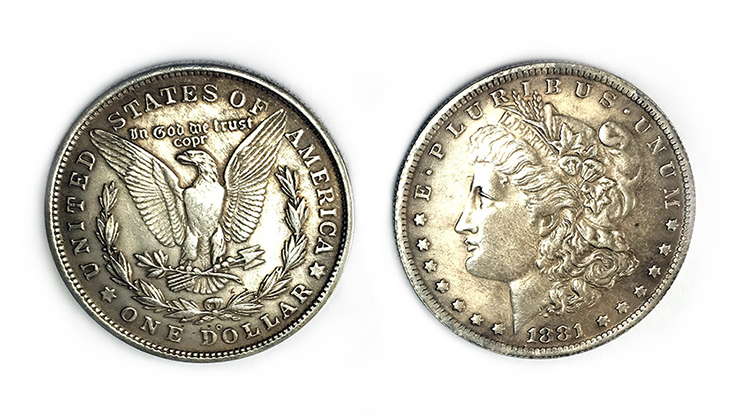 Includes one magnetic Morgan Dollar replica.