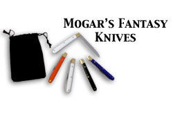 The package consists of a Black/Black, White/White, White/Black, a white/Red/ VC knife and a Red/Black.Also included is a Pocket Holder, a Vinyl carrying case, Written and illustrated Routine instructions.Your audience will really enjoy this one. You can also get a Standard 3 knife set consisting of Black, White, and White/Black.