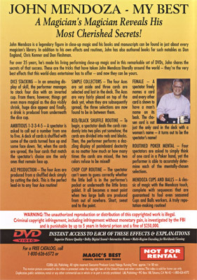 John Mendoza is a legendary figure in close-up magic and his books and manuscripts can be found in just about every magician's library. In addition to his own effects and routines, John has also authored books for such notables as Don England, Chris Kenner and Dan Fleshman. For over 35 years, he's made his living performing close-up magic and in this remarkable set of DVDs, John shares the secrets of that success. These are the tricks that have taken John Mendoza literally around the world - they're the very best effects that this world-class entertainer has to offer - and now they can be yours.