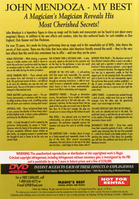 John Mendoza is a legendary figure in close-up magic and his books and manuscripts can be found in just about every magician's library. In addition to his own effects and routines, John has also authored books for such notables as Don England, Chris Kenner and Dan Fleshman. For over 35 years, he's made his living performing close-up magic and in this remarkable set of DVDs, John shares the secrets of that success. These are the tricks that have taken John Mendoza literally around the world - they're the very best effects that this world-class entertainer has to offer - and now they can be yours.