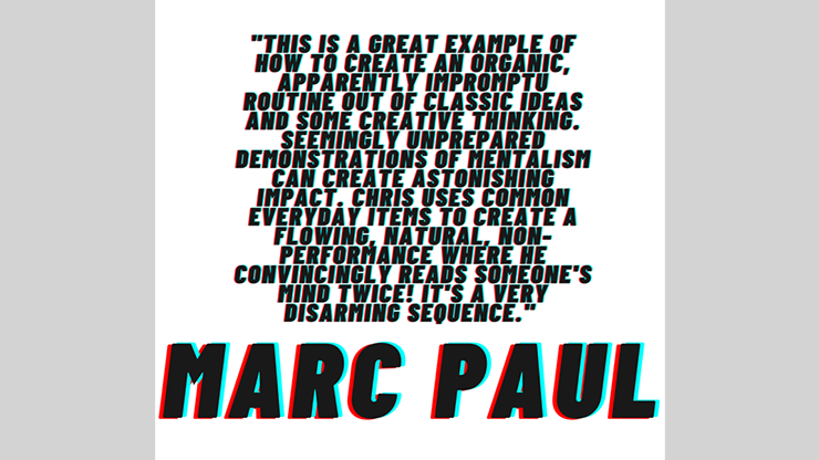 "This is a great example of how to create an organic, apparently impromptu routine out of classic ideas and some creative thinking. Seemingly unprepared demonstrations of mentalism can create astonishing impact. Chris uses common everyday items to create a flowing, natural, non-performance where he convincingly reads someone's mind twice! It's a very disarming sequence."
