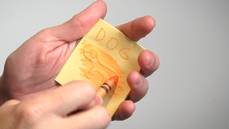 Showing different cards with pets, the spectator select one and the magician will guess it using a crayon Crayola, making scratch over the post-it note will appear the image the pet that the spectator chose, after that the magician shapes in the crayon the figure of the pet selected.