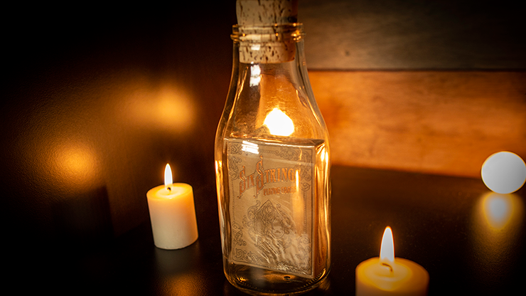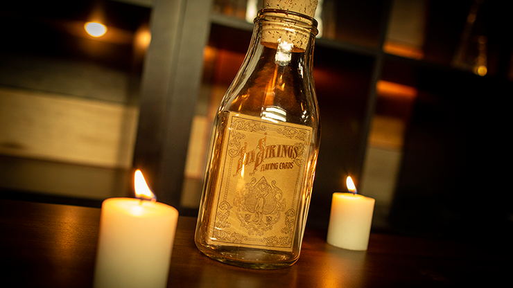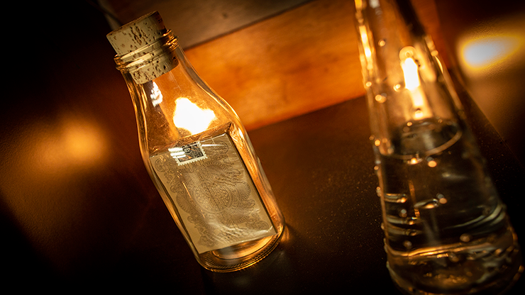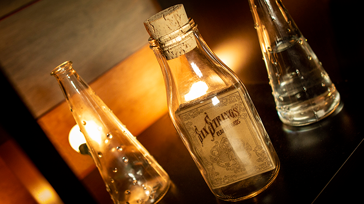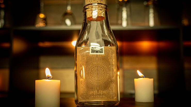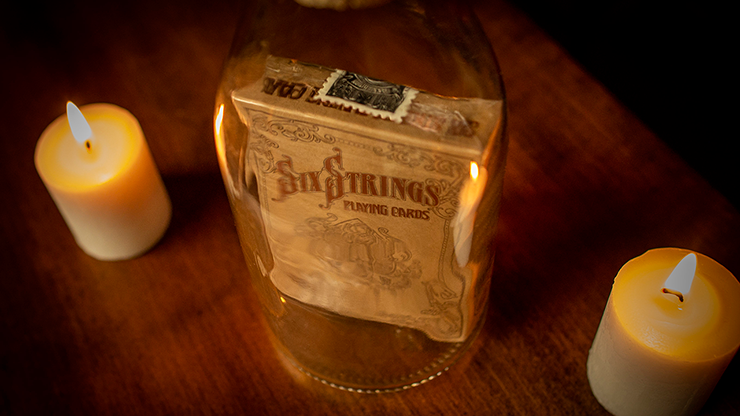 A deck of Six Strings Playing Cards with cellophane/factory seal is impossibly inside a glass bottle. The bottle has not been tampered with, not altered in any way, and its mouth's diameter is impossibly smaller than the deck inside.