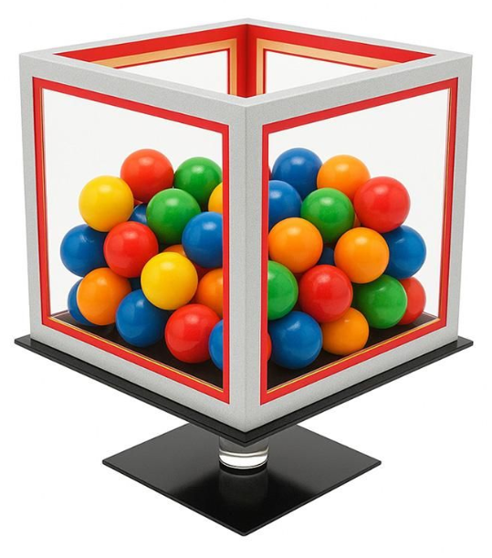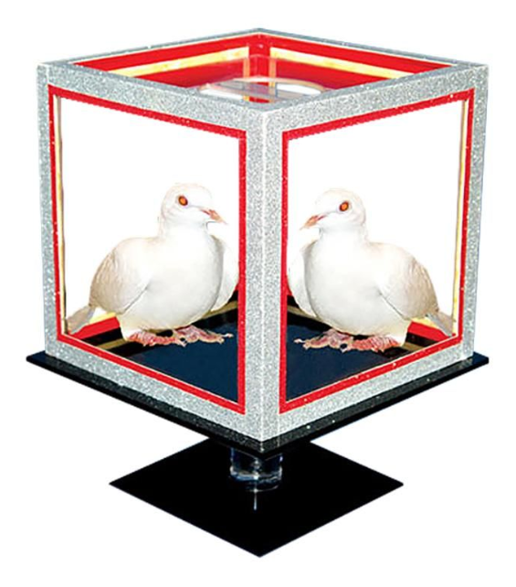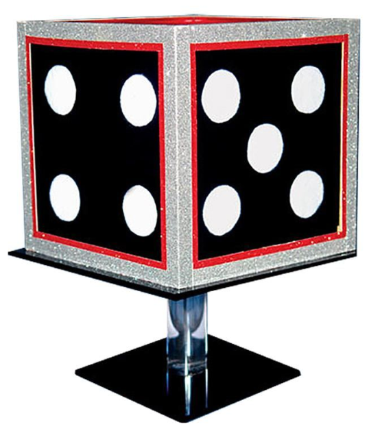 The magician displays a large black die (9 x 9 inches) set on a pedestal and turns it to show all sides. A "cover" with plexiglass walls is placed over the large black die.