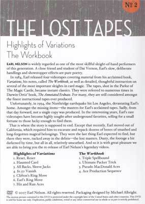 In 1984, Earl released four videotapes covering material from his acclaimed book, Variations, his notes, called The Workbook, as well as detailed, thoughtful instruction on several of the most important sleights in card magic. The tapes, shot in the Parlor of The Magic Castle, became instant classics. They were referred to numerous times in Darwin Ortiz' book, The Annotated Erdnase. For many, they are still considered amongst the finest instructional tapes ever produced.
