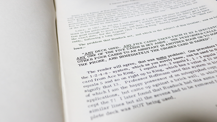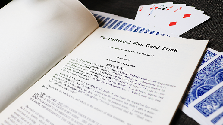 George Blake's Perfected Five Card Trick is a KILLER! Blake teaches multiple variations of the Resduk Enigma. The effect is simple and deceiving. The spectator takes a deck of his own cards and chooses five (no force). The cards are revealed, and the spectator is asked to think of one card of the five and set it aside. The magician picks up his phone and calls a friend. The friend tells the spectator exactly what card he is thinking of!