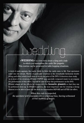A deck of cards appears, the castle. Little by little the cards come to life. Your spectators enter into the dream. Worthy of particular attention is the remarkable horizontal double rising card effect which itself alone is worth the price of the DVD. It deserves close study. As in most of his creations, Bruno COPIN uses specially composed music to accompany the performance of this effect. You will be able to hear this performance on the DVD. Bruno adapts all the effects he creates with his favourite gimmick so that they can be performed close-up. In Bruno's opinion, the most important rule for creating a strong illusion is to be able to hand out the deck for examination BEFORE and AFTER the effect.