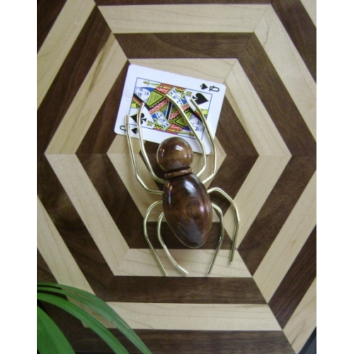 A large solid wood and brass spider rests in the center of its beautiful wooden web on an ornate Victorian stand. A card is chosen and returned to the pack. The card is vanished and the web is given a spin, as it spins a small spot begins to appear on the web. As the spot grows larger it moves to the center where it is caught in the grasp of the spider. When the web stops, it proves to be the selected card. Made of Solid Walnut , Oak and Maple. The beautiful wood marquetry design of the web makes a stunning visual display as it is spinning. Card can be changed easily to any poker size card you wish.
