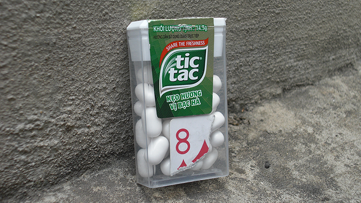 A corner of a playing card is torn off. Magically, it visually melts through the side of a Tic Tac box! The rest of the playing card is held up to the ripped corner that's now inside of the box... it is a perfect match!