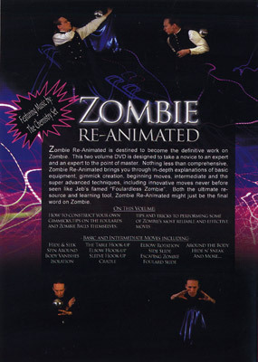 Zombie Re-Animated is destined to become the definitive work on Zombie. This two volume DVD is designed to take a novice to an expert and an expert to the point of master. Nothing less than comprehensive, Zombie Re-Animated brings you through in-depth explanations of basic equipment, gimmick creation, beginning moves, intermediate and the super advanced techniques, including innovative moves never before seen like Jeb's famed "Foulardless Zombie" . Both the ultimate resource and learning tool. Zombie Re-Animated might just be the final word on Zombie.