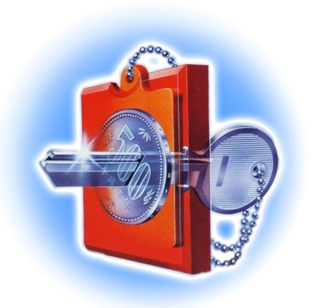 A coin is placed into a small holder at the end of a key chain. The holder is inserted into a frame. Then the key is pushed right through the center of the coin: metal through metal. Then the coin is shown to be unharmed.