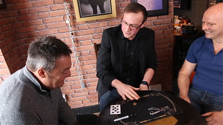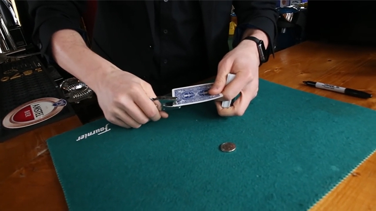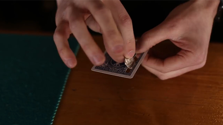 A card is selected and signed (any card, no force required). The magician then punches a hole in the card. Handing the card and a borrowed coin to your spectator, a challenge or puzzle is set. Can they get the coin through the hole without damaging the card?
