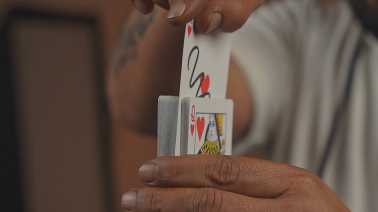 Ein Zuschauer wählt eine Karte aus und unterschreibt sie. Sie wird in den Stapel gelegt - verloren inmitten des Chaos. Dann beginnt das Spiel.