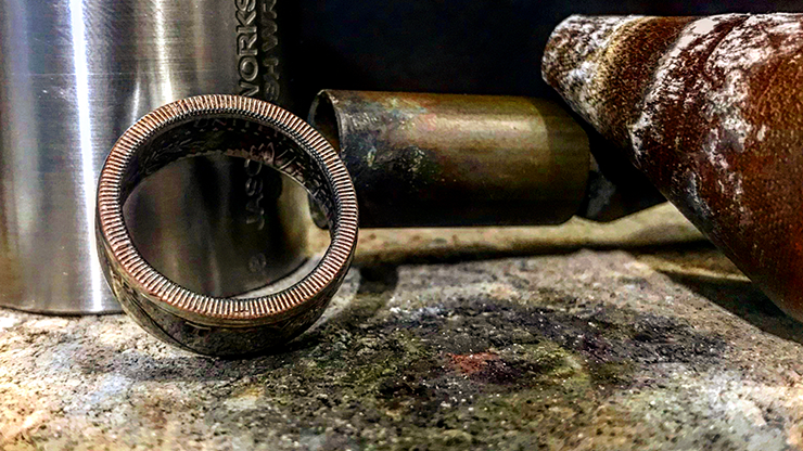 Dieser Ring wurde im Stil und Aussehen einer Kennedy-Half-Dollar-Münze gefertigt. Eine zusätzlich aufgetragene Patina und eine feine Politur geben jedem Ring überdies ein besonders originelles Finish.