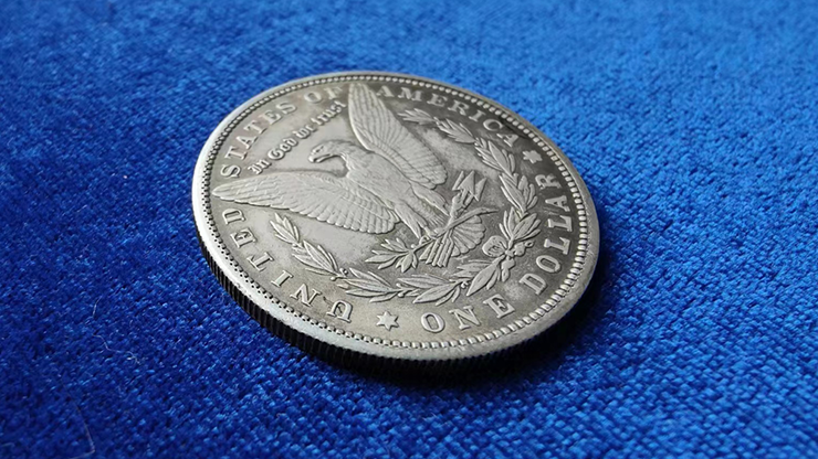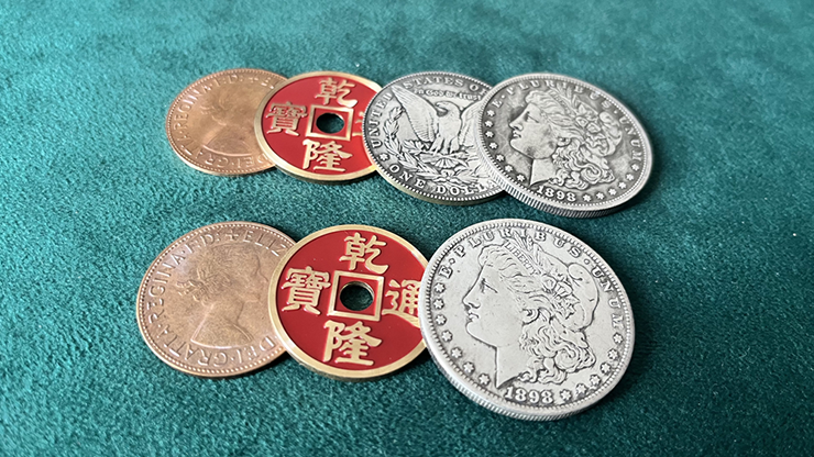 Sie halten vier verschiedene Münzen in Ihrer Hand, zwei silberne Morgan-Münzen, eine Kupfermünze und eine antike Münze. Sie schließen Ihre Handfläche und öffnen sie wieder. Es ist nur noch eine silberne Morgan-Münze in Ihrer Hand! Die anderen drei Münzen sind wie durch Zauberhand verschwunden!