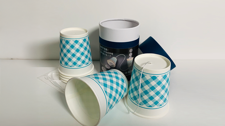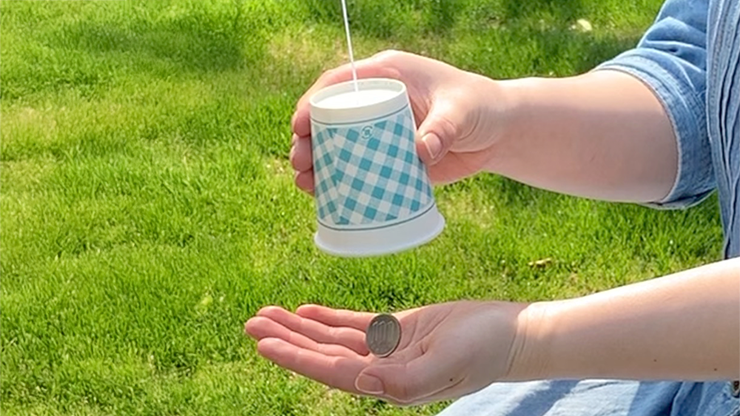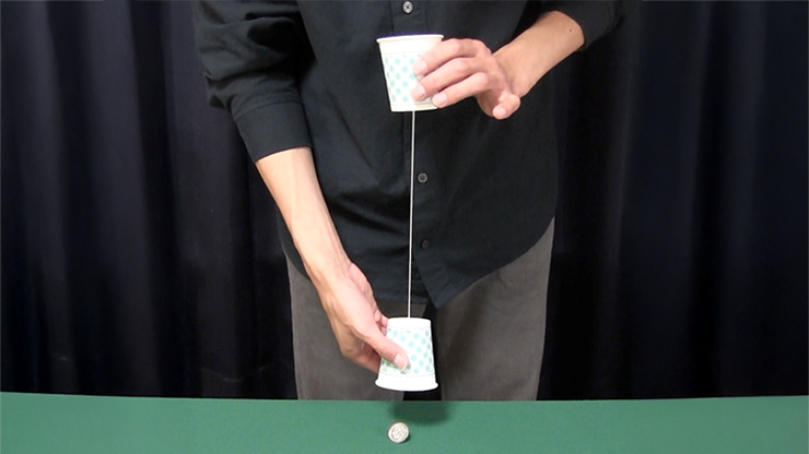 Sie präsentieren zwei mit einem Faden verbundene Becher. In den oberen Becher legen Sie eine Münze. Der untere Becher hängt Kopf über am Faden. Sie ziehen ein wenig am Faden und die Münze fällt aus dem unteren Becher heraus! Der obere Becher ist leer!