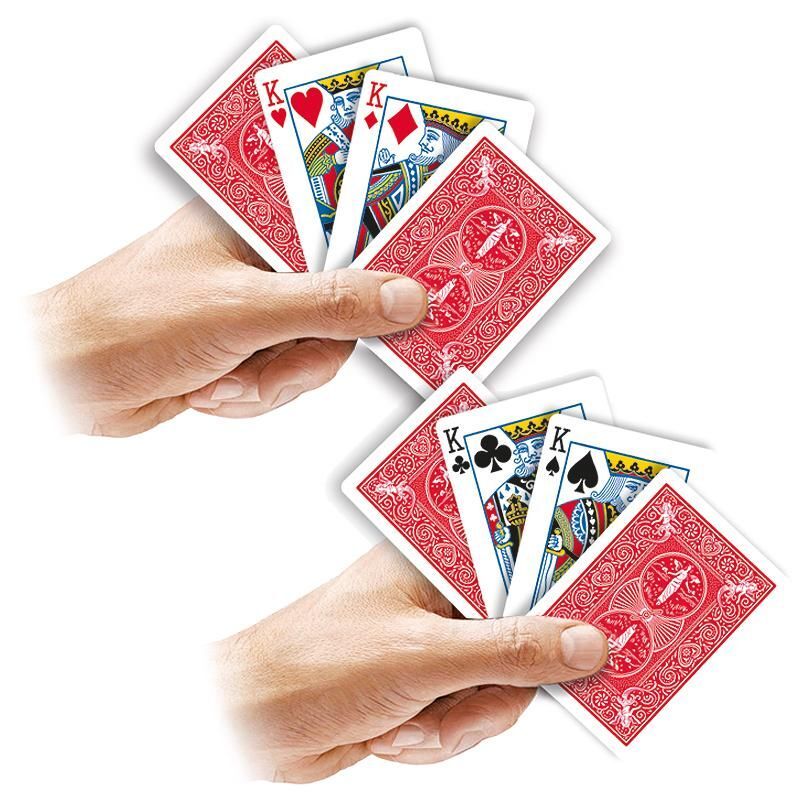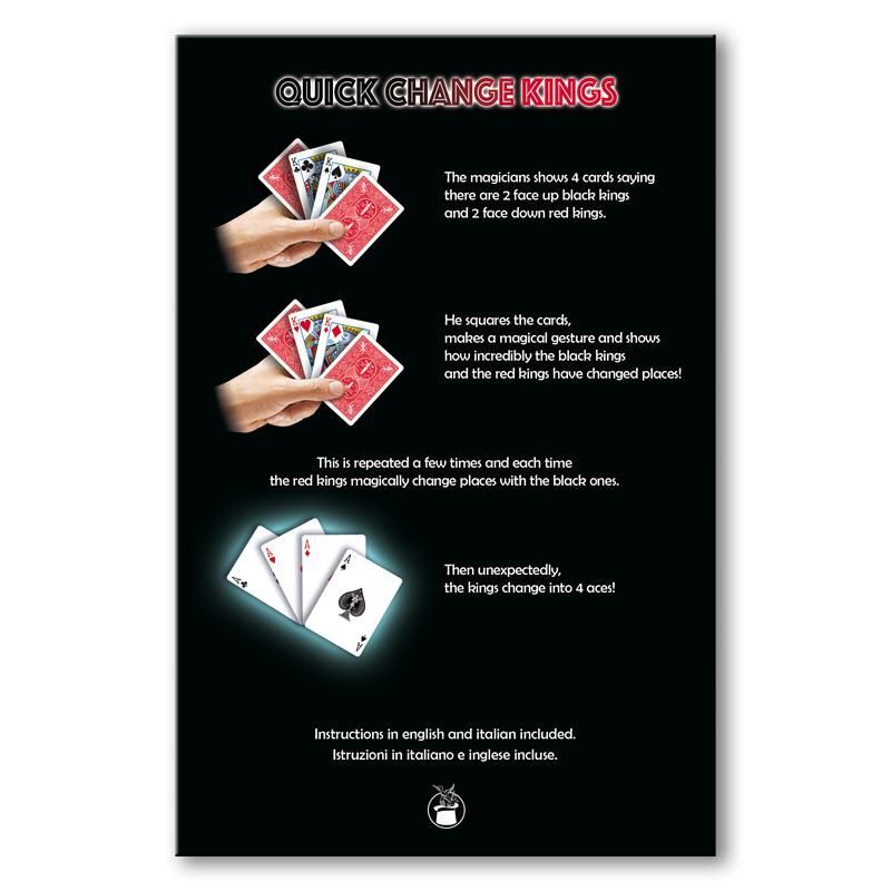 Hier ist ein super lustiger und super einfacher Päckchentrick für dich. Der Zauberer sagt, er habe vier Könige: zwei schwarze Könige mit der Vorderseite nach oben und zwei rote Könige mit der Rückseite nach unten. Auf mysteriöse Weise tauschen die schwarzen Könige den Platz mit den roten Königen. Dies wird ein paar Mal wiederholt, und dann verwandeln sich die Könige unversehens in vier Asse!