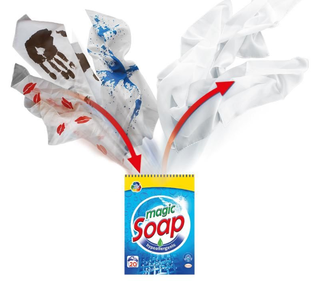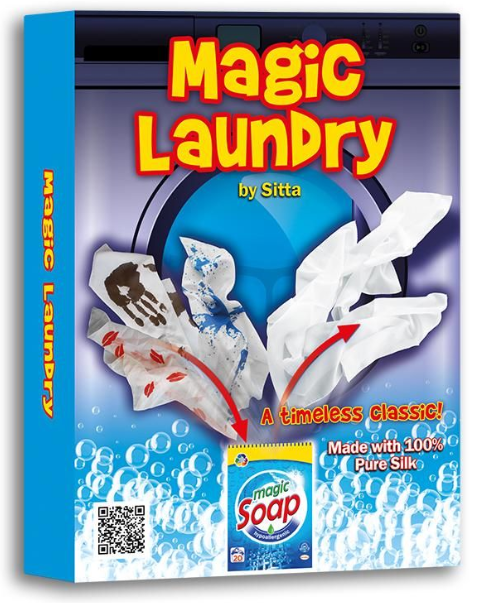 Der Zauberkünstler zeigt drei befleckte Seidentücher und legt sie in eine Schachtel mit Waschmittel (oder einfach in eine Papiertüte aus einem Zeitungsblatt). Er gießt etwas Flüssigkeit in die Schachtel und behauptet, die Schachtel mit dem Waschmittel werde als "magische Waschmaschine" verwendet. Einen Moment später holt er die drei völlig weißen, perfekt sauberen Seidentücher heraus. Schließlich öffnet er die Schachtel vollständig, um zu zeigen, dass nichts darin versteckt ist!