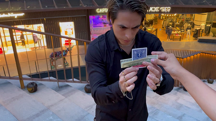 Bei diesem Trick durchdringt die Spielkarte nicht nur einen Geldschein. Die Karte wechselt auch im Handumdrehen ihre Farbe. Zuerst wird nur ein Teil der Karte umgefärbt, dann die komplette Kartenrückseite. Der Geldschein wird dabei nicht beschädigt. Er kann auch zuvor von den Zuschauern ausgeliehen werden.