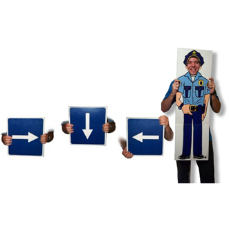 Der Magier zeigt ein Verkehrsschild mit einem grossen Pfeil vor und erklärt, dass dies die korrekte Fahrrichtung angibt. Er zeigt, dass der eine Pfeil auf der einen Seite des Schilds nach links zeigt, der Pfeil auf der Rückseite des Schilds nach rechts zeigt.